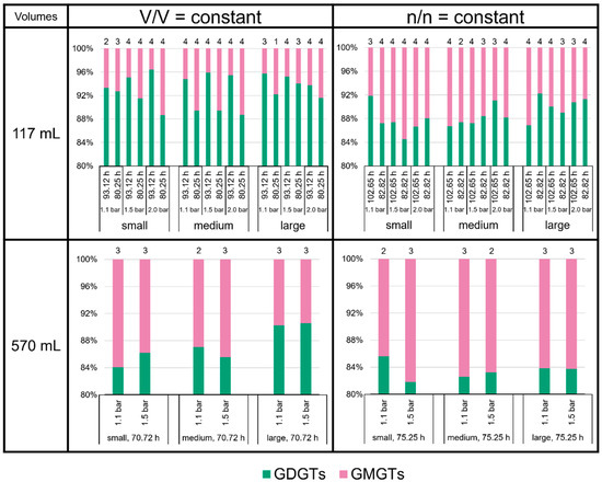 The proportions of the different groups of tetraethers—GDGTs, GMGTs, and GTGT-0a—did not vary largely (Figure 6). The GDGTs were the most abundant tetraethers at all culture conditions, accounting for about 80 to 95% of total tetraether lipids. The GMGTs were the second most abundant group of tetraethers, with an average 4 to 18% of total tetraethers. The relative amount of GTGT-0a lay well below 1% of total tetraethers at most culture conditions. It approached the 1% limit in all samples cultured at V/V = const./93.12 h in the 117 mL bottles, and it even reached more than 2% in some of the smaller volume replicates at n/n = const./1.1 bar in the 117 mL bottles at 102.65 h and in the 570 mL bottles at 75.25 h. However, the standard deviations for GTGT-0a in all cases are very high; therefore, the fluctuations of GTGT-0a are not robust, and the results should be treated with care.