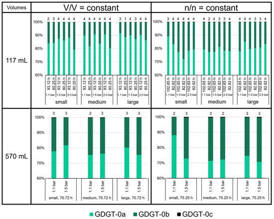 Compared to GDGT-0a and -0b, the relative amounts of GDGT-0c are negligible (below 1% of total GDGTs; Figure 7). With an average 70 to 90%, GDGT-0a shows the highest relative amount among the GDGTs. The highest average proportion of GDGT-0a (91.5%) was measured at large volumes for V/V = const./1.1 bar/93.12 h in the 117 mL bottles. In contrast, the lowest average proportion of GDGT-0a (70.6%) was measured at large volumes for n/n = const./1.5 bar/75.25 h in the 570 mL bottles. The proportion of GDGT-0b and -0c relative to GDGT-0a (degree of methylation) in the 117 mL bottles at V/V = const. (especially those at 93.12 h) was, on average, lower than in the 117 mL bottles at n/n = const., and in all the experiments in the 570 mL bottles.