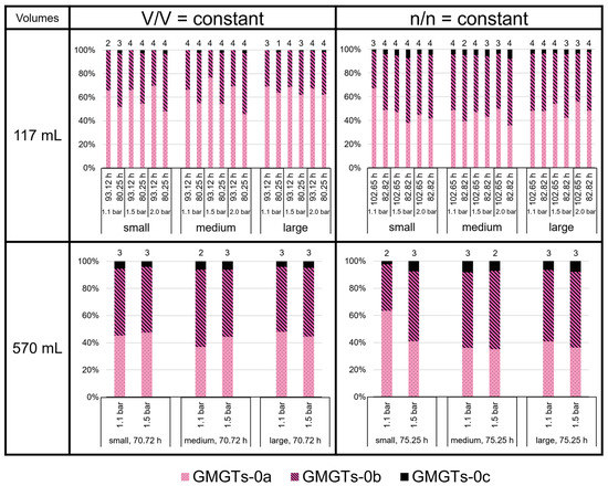 The GMGTs did not show a predominance of the 0a isomers, as shown for the GDGTs (Figure 8). In contrast to GDGT-0c, GMGTs-0c made up between 1 and 7% of total GMGTs at most growth conditions. However, in the 117 mL bottles at V/V = const./93.12 h, GMGTs-0c accounted for less than 1% of total GMGTs, which did not occur in any of the other sets of culture conditions. The relative proportion of GMGTs-0c was highest in the 117 mL bottles at n/n = const./82.82 h in the medium volume at 2.0 bar and in the 570 mL bottles at n/n = const. (except the small volume at 1.1 bar). There, it even reached 8% of total GMGTs. Depending on the culture condition, either GMGTs-0a or GMGTs-0b were predominating, whereas GMGTs-0a were dominant more often. The relative proportion of GMGTs-0b varied between 20% and almost 60% of total GMGTs. The ratio (1 × GMGT-0b + 2 × GMGT-0c)/(GMGT-0a + GMGT-0b + GMGT-0c), indicating the degree of methylation, tended to be higher at conditions with V/V = const., but only in the 117 mL bottles. For the 570 mL bottles, a higher degree of methylation was only observed for the cultures at V/V = const./1.5 bar (Figure 9).