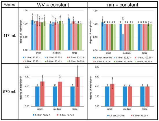 Degree of methylation of the M. marburgensis cultures. Pressure is given in bar relative to atmospheric pressure. Errors are standard deviations. Numbers above bars indicate number of samples.