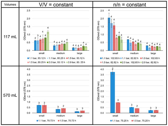 As expected, the experiments performed with a small liquid volume, i.e., a high gaseous volume and, therefore, a high number of gaseous substrates, showed the highest end point optical density (ODend, Figure 10). While for experiments with n/n = const. a longer incubation time led to a higher ODend, this was not observed for the V/V = const. settings. Further, at V/V = const., a higher pressure resulted in a higher ODend, while for n/n = const., the ODend decreased with increasing pressure. However, this trend for n/n = const. could be reversed when dealing with larger volumes, as the 82.82 h pressure series at large volumes may imply. A very remarkable result was the extremely high ODend value accomplished for the n/n = const. experiments at small volumes and 1.1 bar.