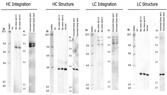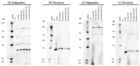 mAb2 genetic integration and structure analysis for the parental clone and re-clone. Southern blot analysis was used to determine the structural and integration profiles of the target HC and LC genes.