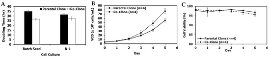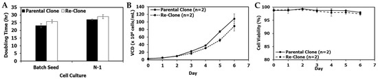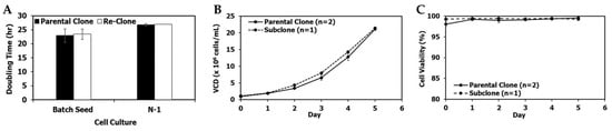 mAb1 seed and N-1 culture performance of the parental and re-clone. (A) Doubling times for the shake flask batch seed cultures and the N-1 5-L cultures, (B) N-1 fed-batch 5-L bioreactor viable cell density (VCD), (C) N-1 viability. The values are reported as average ± difference/2 (n = 2).