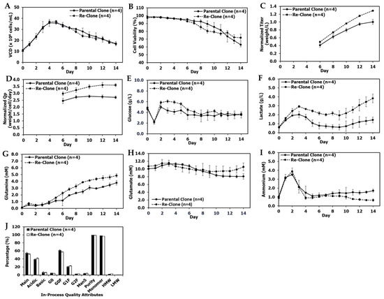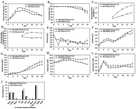 mAb2 production 5L bioreactor culture performance, metabolite and quality attribute profiles between the parental and re-clone. (A) Production 5-L bioreactor VCD, (B) production viability, (C) normalized titer, (D) normalized Qp, (E) production glucose profiles, (F) production lactate profiles, (G) production glutamine profiles, (H) production glutamate profiles, (I) production ammonium profiles, (J) in-process quality attribute profiles on day 14 at harvest. The parental clone day 14 titer was normalized as 1. The values are reported as average ± standard deviation (n = 4).