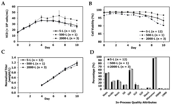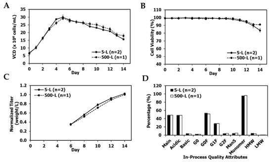 mAb1 re-clone performance was successfully scaled up to the 500-L scale in the pilot plant (Figure 4A–D). VCD, viability, titer, and product quality were similar between the two scales.