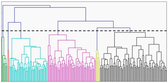 Dendrogram for hierarchical clustering (n = 196). Each color represents once cluster (cluster 1: green, cluster 2: red, cluster 3: blue, cluster 4: pink, cluster 5: yellow, cluster 6: black).