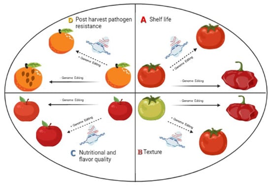 Kumari, C.; Sharma, M.; Kumar, V.; Sharma, R.; Kumar, V.; Sharma, P.; Kumar, P.; Irfan, M. Genome Editing Technology for Genetic Amelioration of Fruits and Vegetables for Alleviating Post-Harvest Loss. Bioengineering 2022, 9, 176. https://doi.org/10.3390/bioengineering9040176