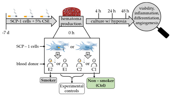 For simulation of smoking conditions in vitro, a combination of smokers’ blood and Cigarette Smoke Extract (CSE) pre-stimulated SCP-1 cells was used. For stimulation of SCP-1 cells, CSE was prepared as described [25]. A 5% CSE (corresponds to 5 cigarettes per day) value was used for pre-stimulation as this previously has been shown to significantly impact the cells’ function [26]. SCP-1 cells were pre-stimulated for 7 days. The medium was changed every 2 to 3 days. Stimulation was renewed with each medium change. Experimental setup is further visualized in Figure 1.