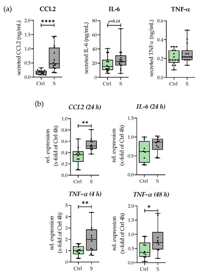 Levels of IL-6, TNF-α, and CCL2 in the culture supernatant were determined by enzyme-linked-immunosorbent-assay (ELISA) following the manufacturer’s instructions (Peprotech, Hamburg, Germany).