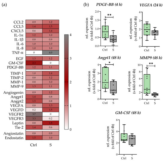 Analysis of angiogenesis-stimulating factors of smokers’ (S) and non-smokers’ (Ctrl) in vitro fracture hematomas. With (a) Secretion of angiogenic factors determined by angiogenesis array. Data are displayed normalized to the overall mean of each target. N = 5 (pooled), n = 4. (b) Gene expression of pro-angiogenic factors VEGFA, Angpt1, MMP9, PDGF-BB, and GM-CSF. N = 5, n = 2. * p < 0.05, ** p < 0.01.