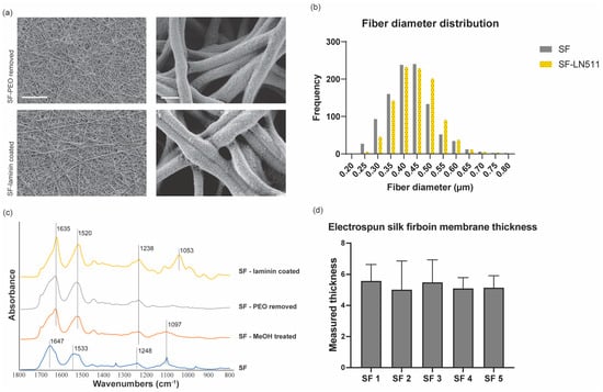- Miguel, S.P.; Simões, D.; Moreira, A.F.; Sequeira, R.S.; Correia, I.J. Production and characterization of electrospun silk fibroin based asymmetric membranes for wound dressing applications. Int. J. Biol. Macromol. 2019, 121, 524–535. [Google Scholar] [CrossRef] [PubMed]