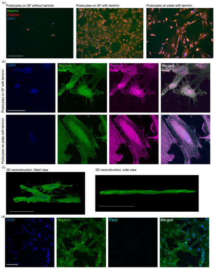 - Satyam, A.; Tsokos, M.G.; Tresback, J.S.; Zeugolis, D.I.; Tsokos, G.C. Cell-Derived Extracellular Matrix-Rich Biomimetic Substrate Supports Podocyte Proliferation, Differentiation, and Maintenance of Native Phenotype. Adv. Funct. Mater. 2020, 30, 1908752. [Google Scholar] [CrossRef]