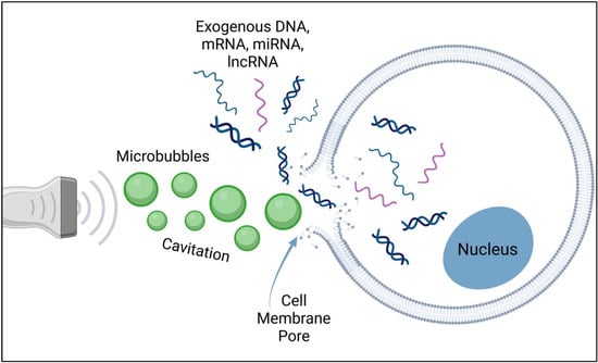 Image depicting the induction of a pore in the cell membrane by cavitation of microbubbles, allowing exogenous nucleic acids to passively diffuse into the cytoplasm. Created with BioRender (BioRender.com, accessed on 20 April 2022).