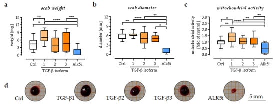 Therefore, the in vitro scabs were incubated for 14 days with either the exogenous addition of one of the three TGF-β isoforms or Alk5i. The exogenous stimuli were refreshed every second day during culture. The scabs were analyzed on days 2, 7, and 14 of the culture. The stability and viability of the scab models were determined by measuring the scab volume, weight, and mitochondrial activity. The results show that inhibition of TGF-β signaling (Alk5i) accelerated the decrease in scab volume and weight observed with culture time. The small scabs remaining at day 14 of the culture in the inhibitor (Alk5i) group were palest in color. Furthermore, the scabs in the inhibitor (Alk5i) group had the lowest mitochondrial activity. Exogenous stimulation with TGF-β1 caused opposite results to the inhibitor (Alk5i) group. The scabs in this group had the highest weight, volume, and mitochondrial activity. Exogenous stimulation with TGF-β2 and TGF-β3 had no significant effect on scab volume, weight, or mitochondrial activity (Figure 6).