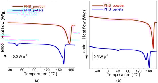 (a) First heating scan and (b) second heating scan of PHB powder and pellets.