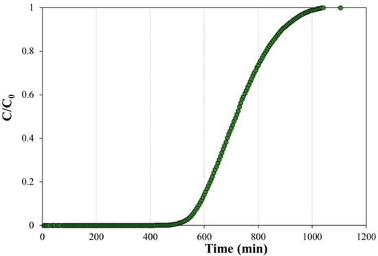 The F curve showed the typical trend of a plug flow reactor (Figure 6) with no stagnant zones of preferential flow paths. A slightly dispersed sigmoid was possibly caused by the non-constant grain size along with the reactor profile, evidently due to the presence of the reactive materials. The resulting HRT was about two days, whereas the effective residence time was equal to 716.7 ± 0.8 min, corresponding to an effective linear velocity of 274.6 cm/day. The empty volume (from the multiplication of the effective residence time and flow rate) was about 3146 cm3, with a porosity of 28%.
