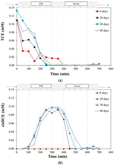It is well-known that the kinetics of degradation decreases with the chlorination degree due to a corresponding decrease in the efficiency, and because a limited group of organohalide-respiring bacteria can perform it [,]. Because of the possible formation and accumulation of harmful intermediates (notably the vinyl chloride (VC), which is a cancerogenic and more volatile compound []), the addition of an electron donor alone to enhance the RD is not sufficient to achieve the remediation objectives [].