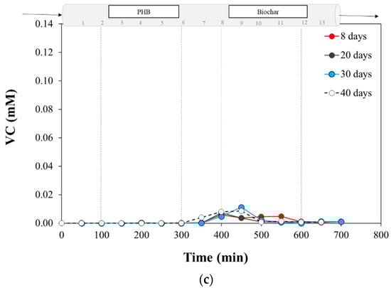 Similarly, from gate number 8 a decrease in the concentration of cis-DCE can also be observed in correspondence with the PWB presence. Otherwise, the same sampling profiles (8, 20, 30, 40 days) do not show an evident formation of VC (Figure 7c). This behavior is in agreement with the evidence of a previous study on the CAB process on PWB supported by lactate, where a breakthrough of the RD products was observed after one month of continuous feeding []. However, it is important to highlight that, at the same time in the reactor (i.e., at the same sampling gate), an increase in dissolved cis-DCE was observed as the days increased. This behavior can be addressed to a different PWB affinity for less chlorinated compounds []. Since the previous test also showed that the biodegradation efficiency depended on the residence time [], only the monitoring of the next few months will be able to bring to light the progress of the RD reaction with consequent conversion to ethylene.