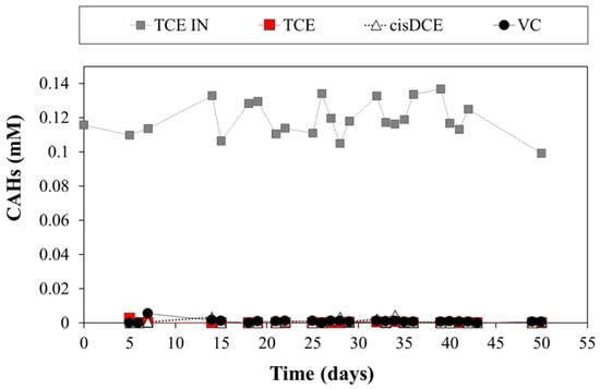 CAHs concentration in the influent and effluent of the reactor during the monitored period.