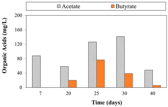 The trend of organic acids in the outlet at 7, 20, 25, 30, 40, and 50 days clearly shows an initial burst in the first month of operation, with a maximum concentration produced at 30 days, with 180 mg/L derived from the sum of acetate and butyrate. As mentioned previously, this finding confirms the higher biodegradability of the PHB-powder. On the other hand, PHB pellets need more time to undergo biological degradation, since a lower specific surface area is available for microorganisms’ biodegradative activity []. Considering the 8 and 20 reducing equivalent for acetate and butyrate [], the reducing equivalents for organic acids formation were 101.8, 62.5, 148.1, 169.1, 54.7, and 43.0 meq/day, calculated at 7, 20, 25, 30, 40, and 50 days, respectively.