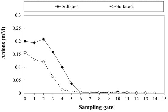 It is well known in the literature that sulfate may reduce the kinetics of CAHs degradation (using H2 as substrate), and this phenomenon is typically found in chlorinated contaminated sites. Moreover, even though SO42− is quite tolerated by bacteria, its reduction to sulfide could be toxic for microorganisms [,]. In this regard, Mao et al. (2017) published an interesting analysis of the effects of the sulfate-reduction on D. maccartyi, concluding that sulfide is the toxic compound that inhibits these bacteria []. In this context, sulfate levels were monitored, since tap water was used for the feeding solution. The average sulfate concentration in the influent was about 18.8 mg/L (0.2 mM), and two representative patterns are reported as an example (Figure 10). As expected, the sulfate reduction occurred rapidly in the early reactor zone without negatively affecting the degradation of TCE (as described in Section 3.3). Since the behavior was similar over the investigated period, it was decided to reduce the frequency of monitoring the sulfate profile.