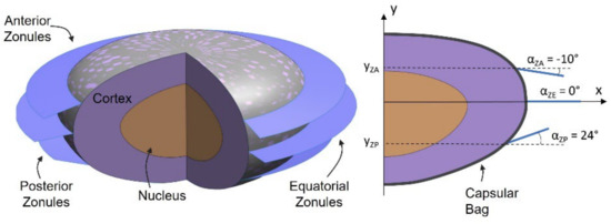 - Cardoso, M.T.; Feijóo, B.; Castro, A.P.G.; Ribeiro, F.J.; Fernandes, P.R. Axisymmetric finite element modelling of the human lens complex under cataract surgery. Symmetry 2021, 13, 696. [Google Scholar] [CrossRef]