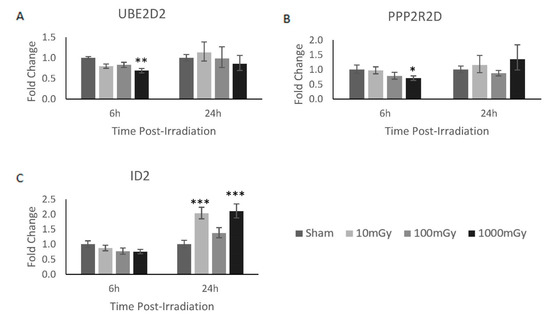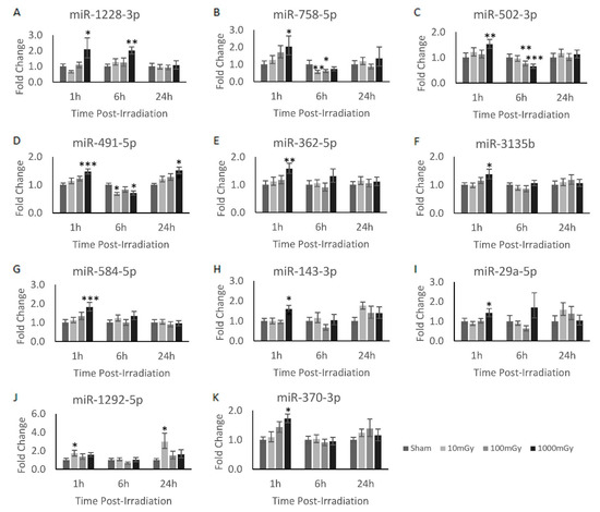 | Dose (mGy) | miRNA | Fold Change | p-Value |