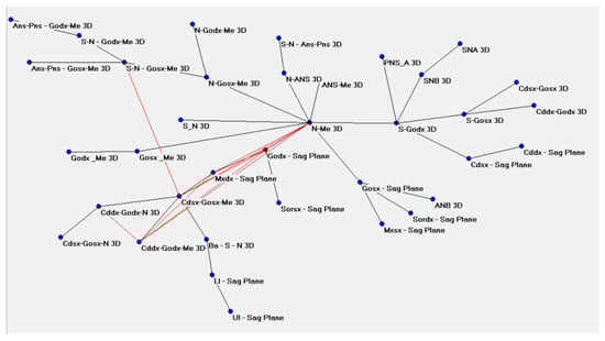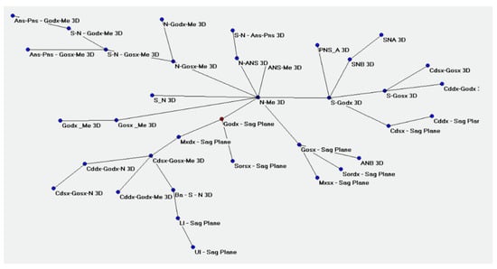 As the data had a normal distribution, the mean values of the 3D and 2D cephalometric measurements were compared by Student’s paired t-tests. The significance level was set at 0.05. Finally, the resulting data were analyzed by ACM (AutoCM, Semeion, Italy), as previously described by Buscema et al. [], to identify the betweenness centrality and authority node metrics. All the nonquantitative values were displayed as binary (for example, male/female 0/1). We set a value of 1000 epochs and a learning rate of 0.1. The resulting neural maps were exported as a file type *.net and displayed in a visual map calculator, Pajek, with the command: File > Network > Read (V 5.14, Operating system: Windows 11; http://pajek.imfm.si/doku.php. accessed on 10 November 2021.).