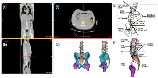 Measurement of sagittal parameters in 3D lumbopelvic model. (a) Coronal view, (b) sagittal view, and (c) axial view of CT images; (d) 3D lumbopelvic model; (e) definition of lumbopelvic parameter; (f) measurement in 3D lumbopelvic model.
