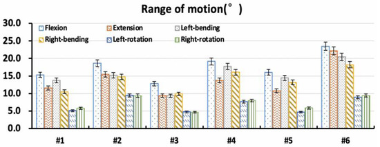 Under different loading conditions, the torque–displacement curves of the six specimens in vitro were hysteresis circles, as shown in Figure 3. The ROM was described as the average of the six values on the upper and lower boundaries of the hysteresis curve. Under the same loading conditions, the whole ROM of the L1–S1 segments varied between lumbar specimens due to structural and organizational differences. In general, the maximal ROM of the L1–S1 segments occurred in flexion ranging from 15.32° to 23.46°, and the minimum appeared in axial rotation ranging from 4.72° to 9.44°. The ROM varied between 9.37° and 22.18° MPa, and 10.50° and 20.46° under extension and lateral bending, respectively (Figure 4). The standard deviation of measurement was between 0.23° and 0.88°, and the error was within 5%.