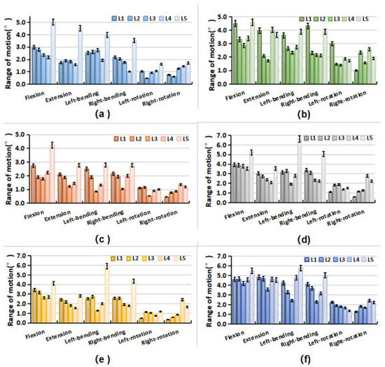 Range of motion of each vertebra in lumbar specimens under different loading. (a) Specimen-1; (b) Specimen-2; (c) Specimen-3; (d) Specimen-4; (e) Specimen-5; (f) Specimen-6.