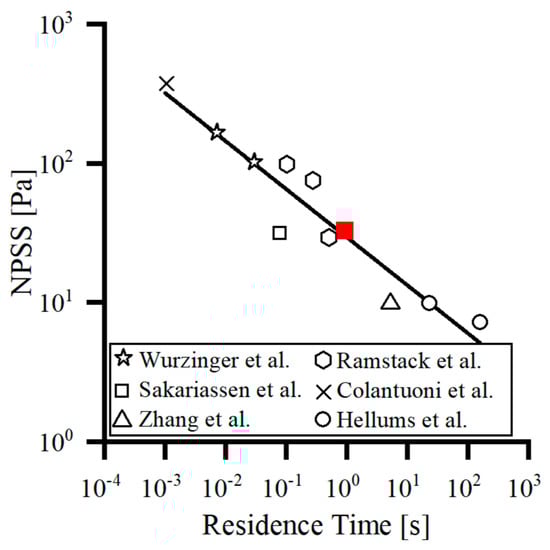 The shear rate threshold of 10,000/s (35 Pa for NPSS) proposed by Xu et al. [] was employed as the threshold value for this study. Based on the fitted NPSS-RT curve by Fraser et al. [] (Figure 2), the threshold value of the residence time was obtained as 1 s (red marker), which showed that platelets can be activated induced by shear stress greater than or equal to 35 Pa for a maximum exposure time of 1 s. Whereas, if shear stress is less than 35 Pa, the role of shear-indued platelet activation leading to thrombotic risk decreases due to the setting of the threshold function of Equation (12), and the long residence time leading to blood pooling is the main factor for thrombus formation. Therefore, one second was applied as the threshold value for blood pooling. When the variable is below 2 to 3 times the threshold, then the reaction resulting from that variable can be considered to be completely stopped []. The thresholds for the other variables and their origins can be found in Table 1.
