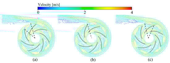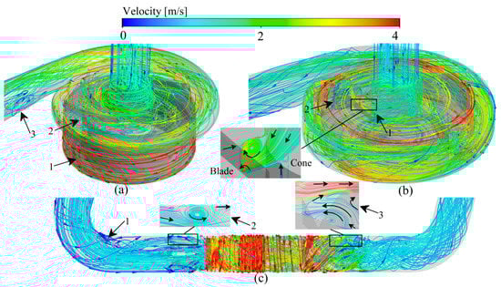Typical streamlines of the relative velocity predication of three studied VADs: (a) CH-VAD; (b) HVAD; (c) HMII.