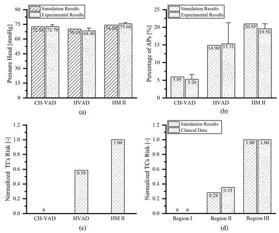 The studied VADs were all able to provide pressure heads about 70 mmHg under their clinical conditions [,,]. The simulation results were in good agreement with the experimental results [] (mean error of 2%), demonstrating the accuracy of the numerical method (Figure 5a). The activated platelets by the three VADs obtained by simulation under simulation conditions (Figure 5b) was in highly consistent with the experimental results performed by Zachary et al. [] with healthy human blood at the same conditions (correlation coefficient r2 = 0.984). This proves the accuracy of the platelet activation model developed in this study. Among the three studied VADs, CH-VAD had the lowest to activate platelets and the lowest probability of thrombus appearance and the HMII had the highest possibility of platelet activation and thrombosis formation, as reflected by the normalized thrombosis risk (based on volume-averaged TCs) (Figure 5c). The present study also compared the risk of thrombosis in three regions within the HMII (Figure 1c) with the risk of thrombosis in these three regions based on the clinical statistics of the HMII performed by Rowlands et al. [] They carried out a retrospective analysis on 29 HMII devices that had thrombus after clinical use to determine the frequency, composition, and localization of macroscopic thrombosis. The high correlation between normalized simulations and statistical results (Figure 5d) demonstrates the validity of the thrombus model constructed in this study (correlation coefficient r2 = 0.994).