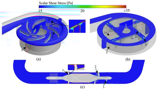 Scalar shear stress prediction of three studied VADs: (a) CH-VAD; (b) HVAD; (c) HMII.
