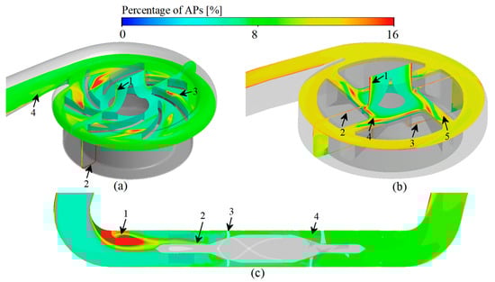 For CH-VAD, the LRT in the near-wall region of the inlet pipe leads to a higher deposition of APs (Figure 9a, marker 1). The HSSS in the secondary flow passage greatly activates platelets, and APs accumulate in the inner side of the secondary flow passage (HSSS and LRT region) as the blood flow moved (Figure 9a, marker 2). The combination of HSSS (generated by the collision of secondary flow with the main flow) and the LRT (generated by the disturbance of secondary flow to the main flow) results in a higher number of APs appearing near the intersection region of the secondary flow and the main flow (Figure 9a, marker 3). The LRT region near the volute tongue leads to more APs stagnation here (Figure 9a, marker 4).