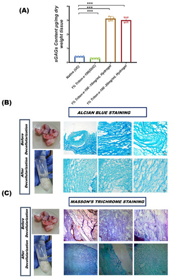 Figure 3. Quantitative and qualitative analysis of extracellular matrix. (A) sGAGs quantification by DMMB assay. (B) Alcian blue staining revealed the retention of sGAGs in the ECM of DUC (n = 3, per study group, *** p < 0.001): GAGs are light blue. (C) Masson’s trichrome staining showed collagen fiber images of native and DUC tissue.