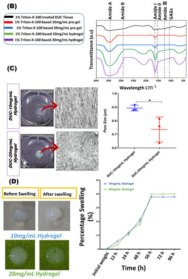 Figure 4. Schematic representation of decellularized tissue hydrogel (3D scaffold) and its biochemical and structural analysis: (A) Decellularized samples were lyophilized in a freeze dryer (a). The lyophilized tissues were then ground using mortar and pestle until they completely turned into a fine powder (be). Lyophilized powder was exposed to UV light for 30 min inside the biosafety cabinet (f). Pepsin/HCl digestion of lyophilized tissue powder (g) was carried out for at least 12 h to allow decellularized tissue to digest in this dissolution medium and to turn into pre-gel (h). Pre-gel was neutralized and then allowed to gel by incubating at 37 °C for 20–30 min to completely turn it into hydrogel (ik). (B) FTIR spectra of DUC tissues, 10 mg, 20 mg pre-gel, and hydrogel reveal sharp peaks representing characteristic amide A, B, I, II, III, and GAGs regions are indicated by the dotted lines in the range of 4000–400 cm−1. (C) SEM micrograph of DUC tissue hydrogel revealed fibers rich in morphological characteristics with porosity, the pore size was significantly lower * p < 0.05 in 20 mg/mL hydrogel. (D) Percentage swelling behavior of 10 mg/mL and 20 mg/mL DUC hydrogel plot at various time points; 12 h, 24 h, 48 h, 56 h, 72 h, and 96 h.