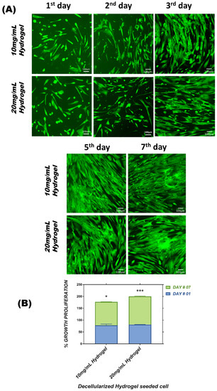 Live cell imaging of 3D cultured MSCs was performed by Calcein AM staining (Invitrogen, Thermo Fisher Scientific, Wilmington, NC, USA). The dye changes its color from nonfluorescent to green fluorescent when hydrolyzed by viable cells. Cell-seeded DUC hydrogels were plated in a 24-well plate, washed with PBS, and incubated with 10 µM working solution of Calcein AM stain for 30 min at 37 °C. The cell viability was examined at respective time points, i.e., 1st, 2nd, 3rd, 5th, and 7th day. The green fluorescent cells were observed under microscope at a wavelength of 469/525 nm and images were captured via CCD camera (Ti2, Nikon, Japan).
