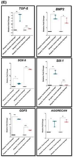 UC-MSCs were cultured at a density of 0.2 million cells in 200 µL hydrogel, supplemented with chondrogenic induction media. MSC-seeded hydrogels cultured in stromal media and 2D-cultured MSCs were used as controls. All samples were harvested after 28 days of culture. Total RNA was isolated by Trizol (15596026, Invitrogen) extraction method as per manufacturer’s instructions. RNA pellets were collected and dissolved in 25 μL nuclease free water. RNA concentration was measured by absorbance measurement at 260 nm wavelength, 260/280 nm ratio was used to analyze the purity of RNA samples using a UV–visible spectrophotometer (UV-1700, Shimadzu, Japan). Then, cDNA was prepared from 2 μg of RNA using a cDNA synthesis kit (™ RevertAid™, K1622, Thermo Scientific, USA) according to the manufacturer’s instructions. The primers for specific genes were designed by primer blast (https://www.ncbi.nlm.nih.gov/tools/primer-blast/ accessed on 15 May 2020). A detailed description of primer sequences and annealing temperatures is given in Table 1. For gene expression analysis, 10 ng cDNA was mixed with bright Green 2X qPCR Master Mix (Abm, Inc., Vancouver, Canada) using Real-Time PCR System (Cfx96, Biorad, Hercules, CA, USA) for quantitative expression of chondrogenic marker genes. The Ct values of treated and untreated samples were normalized to reference GAPDH gene and relative gene expression was determined by 2−ΔΔCt (Livak) method. The experimental groups are shown in Table 2.