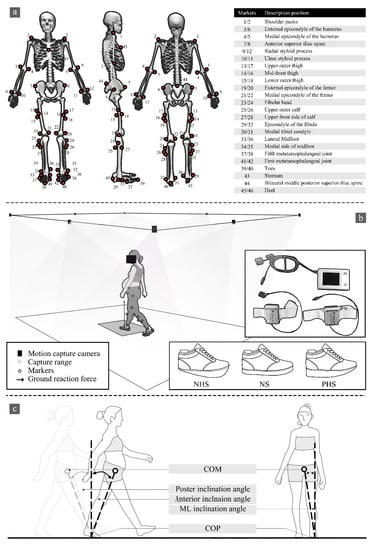 Statistical analyses were performed using SPSS 16.0 (SPSS, Chicago, IL, USA) statistical analysis software. One-way repeated-measures analysis of variance (ANOVA) was performed to analyze the effects of different conditions on spatiotemporal parameters and peak COM-COP inclination angles. In the event of a significant main effect, post-hoc pairwise comparisons were conducted on all significant main effects, using a Bonferroni adjustment. Statistical parametric mapping based on the SPM1D package for Matlab (Mathworks, Natick, MA, USA) was used to compare the 3D GRF and COP statistically. In agreement with Patakt et al., SPM was implemented hierarchically, analogous to one-way repeated measures ANOVA (SPM F) with a post-hoc paired t-test []. The conditions NS vs. NHS, NS vs. PHS, and PHS vs. NHS were chosen to compare the 3D-GRF and COP waveforms [,]. The significance level was set at 0.05.