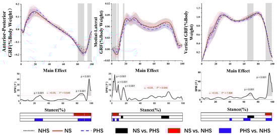 The post-hoc analysis results showed that the ML-GRF of NS was significantly larger than PNS during the stance phase (14.5–17.7%; 71.9–82.6%) (p < 0.001). At the 1.3–9.4% stance phases, the ML-GRF of NS was significantly more significant than the NHS (p < 0.001). At 1.3–4.6% and 8.8–10.3% of the stance phase, the ML-GRF PHS was significantly greater than NHS (p < 0.05).