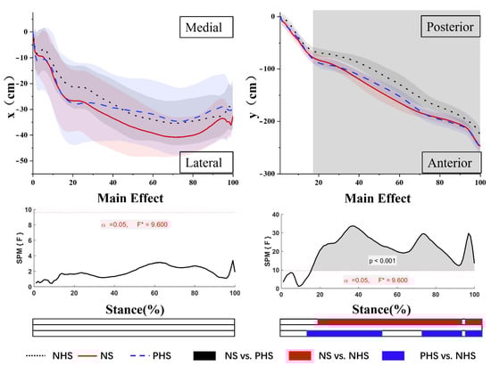 As shown in Figure 3, the results showed no difference in ML-COP between NHS, NS, and PHS. For AP-COP, there was a main effect. Post-hoc analysis showed that NHS demonstrated a significantly smaller range of AP-COP in NHS vs. NS for 19–90.5% and 93–100% of the stance phase. At 14.5–53.1%, 68.5–90% and 93.5–100% of the stance phase, the NHS posterior COP was significantly smaller than PHS (p < 0.05).