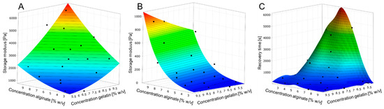 Metamodels of hydrogel behavior according to DoE. (A): Storage modulus depending on the gel component concentrations at 25 °C. (B): Storage modulus depending on the gel component concentrations at 37 °C. (C): Time required reaching the yield point at 25 °C after heating the hydrogel to 37 °C.