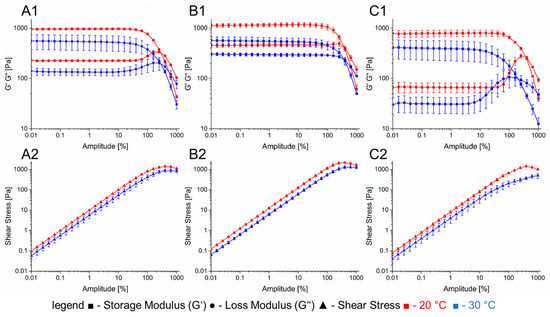 However, at 37 °C, only an increase in alginate concentration causes a higher storage modulus whereby the concentration of gelatin has no effect. Within the viscoelastic range, all samples at 37 °C exhibited tan δ > 1 showing viscous characteristics. The time to reach the yield point (tan δ = 1) after cooling down from 37 °C to 25 °C is strongly connected to the concentration of the hydrogel components. In general, the increase in one hydrogel component concentration leads to a faster gelation while this effect is intensified with higher concentrations of both gelatin and alginate. Resulting from these experiments, three hydrogels (Figure 2) were chosen for the bioprinting process and rheologically characterized at the relevant process temperatures of 20 °C and 30 °C.