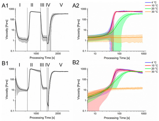 Rheological simulation of the bioprinting process. Section 1 shows the different stages of the process with varying shear rate and temperatures. Phase I: Preheating of the hydrogel for cell seeding. T = 37 °C, = 1 1/s; Phase II: Cooling of the hydrogel. T = 4 °C, = 1 1/s; Phase III: Preheat of the hydrogel for printing process. T = 30 °C, = 1 1/s; Phase IV: Bioprinting Process, T = 30 °C, = 500 1/s; Phase V: Cooling of the hydrogel on the printing substrate, T = 20 °C, = 1 1/s. Section 2 shows a more detailed course of the rheology in phase V but with different temperatures. (A): 6% Gelatin 2% Alginate hydrogel. (B): 6% Gelatin 4% Alginate hydrogel.