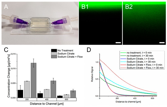 The diffusion of FITC-dextran throughout the crosslinked cell-free hydrogel was investigated under three conditions. Firstly, the hydrogel was used after crosslinking without further treatment. After 30 min, due to the diffusion of FITC-dextran, an expansion of the fluorescence signal throughout the hydrogel was observed. However, the signal’s intensity decreased with prolonged distance from the supply channel, as observed in Figure 4. The second measurement was performed with hydrogels treated with sodium citrate. Here, the diffusion rate of FITC-dextran approximately doubled compared to non-treated hydrogels albeit the absolute diffusion rate of hydrogels treated with sodium citrate shows also a strong decrease with increased distance from the supply channel. The third method included the treatment of the hydrogels with sodium citrate but with a continuous addition of FITC-dextran in the channel. Here, the diffusion rate of FITC-dextran was more than twice as high as the diffusion rate with a single injection. It is also worth mentioning to consider the fluorescence signal in regions close to the channel. While FITC-dextran was added per injection, the fluorescence signal close to the channel after an incubation time of 30 min was lower than at the beginning, while the continuous addition caused a signal increase in this region. However, with regard to these measurements, one has to consider that although the image acquisition was started directly after injection of FITC-dextran, minor diffusion took place before the first micrograph. This could have led to deviations in determining the diffusion rate.