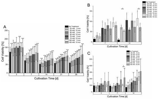 Cell viability of different mono cultures in a 6% gelatin 2% alginate hydrogel within a culture time of 14 or 28 days. (A): HepG2 (n = 4). (B): HUVEC-TERT2 (n = 3). (C): Fibroblasts (n = 4). The cell laden hydrogels were treated with different concentrations and incubation times of sodium citrate. The cell viability of each day is normalized to the signal on day 1 after bioprinting. Statistical significance was tested for all samples on each measurement day by comparing the respective sample without treatment of sodium citrate as well as with samples having the same sodium citrate concentration but different incubation time (significance level: * p > 0.05, ** p > 0.01, *** p > 0.005).