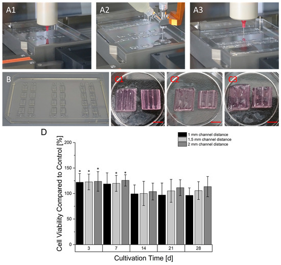 Manufacturing process of prevascularized constructs. In the first step a base layer was printed (A1) followed by the deposition of the coaxial printed hollow strand in a meander-linked manner over all base layer of a printing sequence (A2). In the last step, the space between the hollow channels was filled with another cell-laden gel (A3). A printing sequence created samples with one continuous hollow strand (B). The hollow strands that are not embedded in the hydrogel substrate were mechanically separated. The corresponding prevascularized constructs had different distances between their channels ranging from 1 mm (C1), 1.5 (C2) to 2 mm (C3). The left constructs still contain the core-located gelatin while the material is aspirated in the right constructs (Scale Bar: 4.5 mm). (D): Time dependent cell viability of prevascularized HepG2-laden constructs. The cell viability at every time point is normalized to the viability of a non-prevascularized construct serving as the control. Graphs marked with * show a statistical significance compared to avascular sample (significance level: * p > 0.005, n = 8).