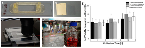 Manufacturing process, set up and resazurin conversion of HepG2 in prevascularized constructs after continuous cultivation. (A): 3D printed miniaturized bioreactor made of COC printed on a COC slide. (B): Laser structured adhesive foil on carrier foil (left) and after removal from carrier foil (right). (C): Printing process of the bioreactor on a heated aluminum-based slide carrier. (D): Set-up of bioreactors in the incubator connected to the fluidic system. (E): Time-dependent cell viability of continuously cultured prevascularized HepG2-laden constructs. The cell viability at every time point is normalized to an equivalent statically cultured construct serving as a control. Graphs marked with * show a statistical significance compared to their statically cultured equivalent (significance level: * p > 0.005 n = 6).